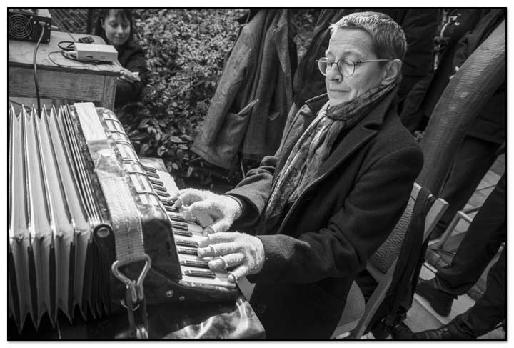 Mezi flétnou a saxofonem se linou zvuky houslí z kouzelných rukou Dorothey Kellerové. Mezi houslemi a flétnou ještě na schodech sedí Dada Klementová a hraje na speciální hudební nástroj - metalofon, který si koupila na trzích v bývalém východním Německu.