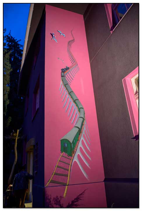 Secco malba vlaku Tišnovka na fasádě Kristkova domu.