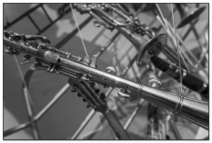 Nástroje žesťové. Některé nástroje Lubo dostal od kamarádů, muzikantů a příznivců. Některé koupil a jeden dokonce dostal darem jako ocenění....